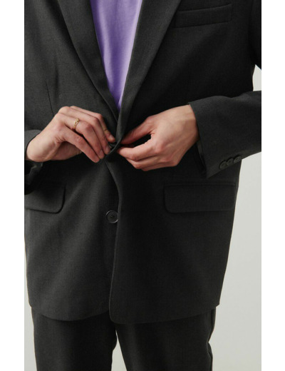 Réponse : Le blazer est conçu dans une matière légère et souple, offrant confort et tenue, bien que la composition exacte ne soit pas précisée.
