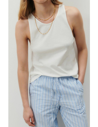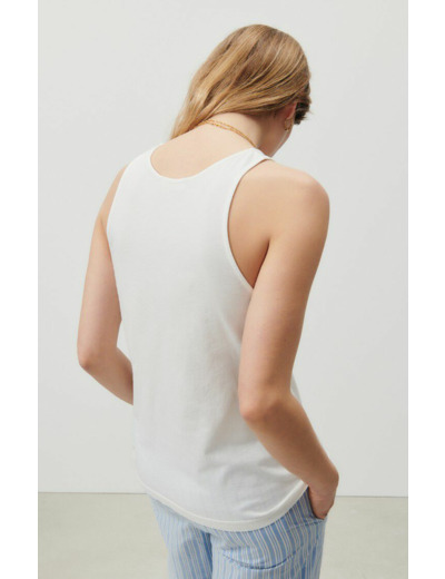Réponse : Le débardeur est fabriqué dans une matière douce et légère, typique des créations American Vintage, garantissant confort et respirabilité.