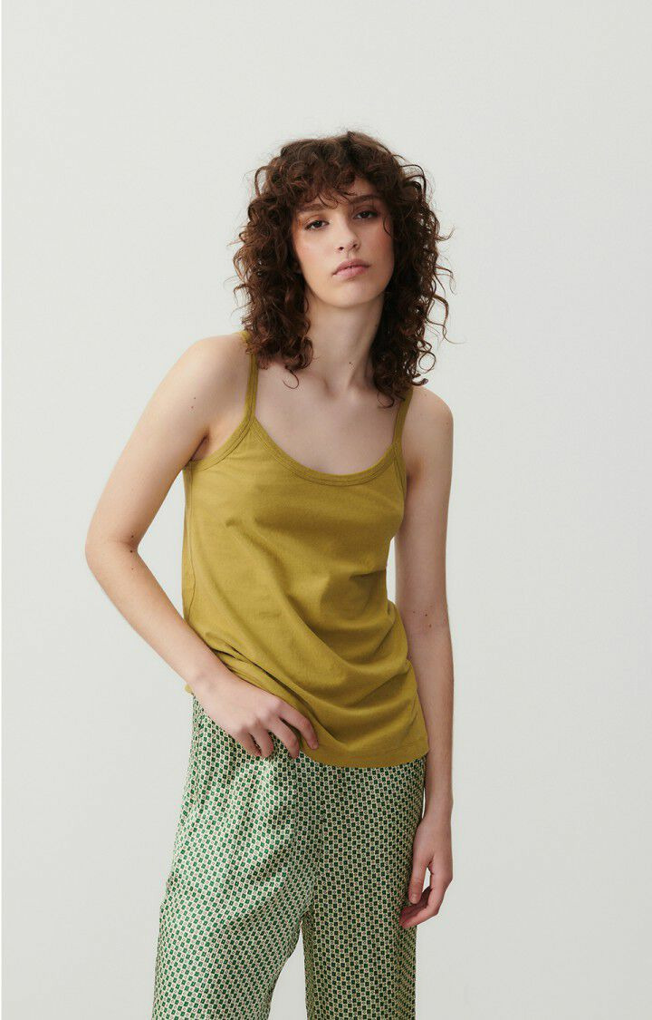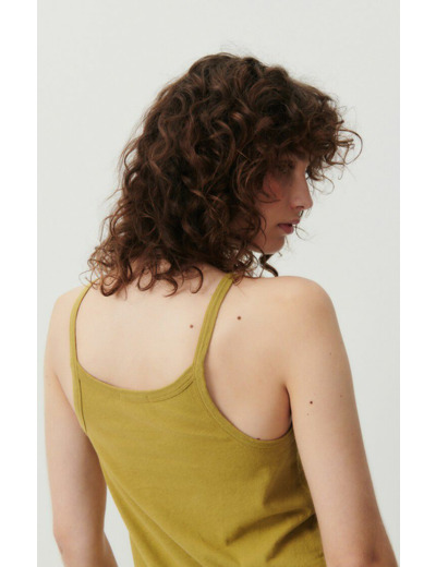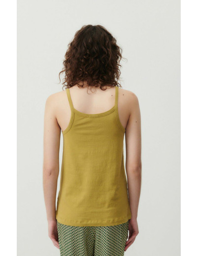 Réponse. Le débardeur est conçu dans une matière douce et respirante, typique des créations American Vintage, assurant confort et durabilité.