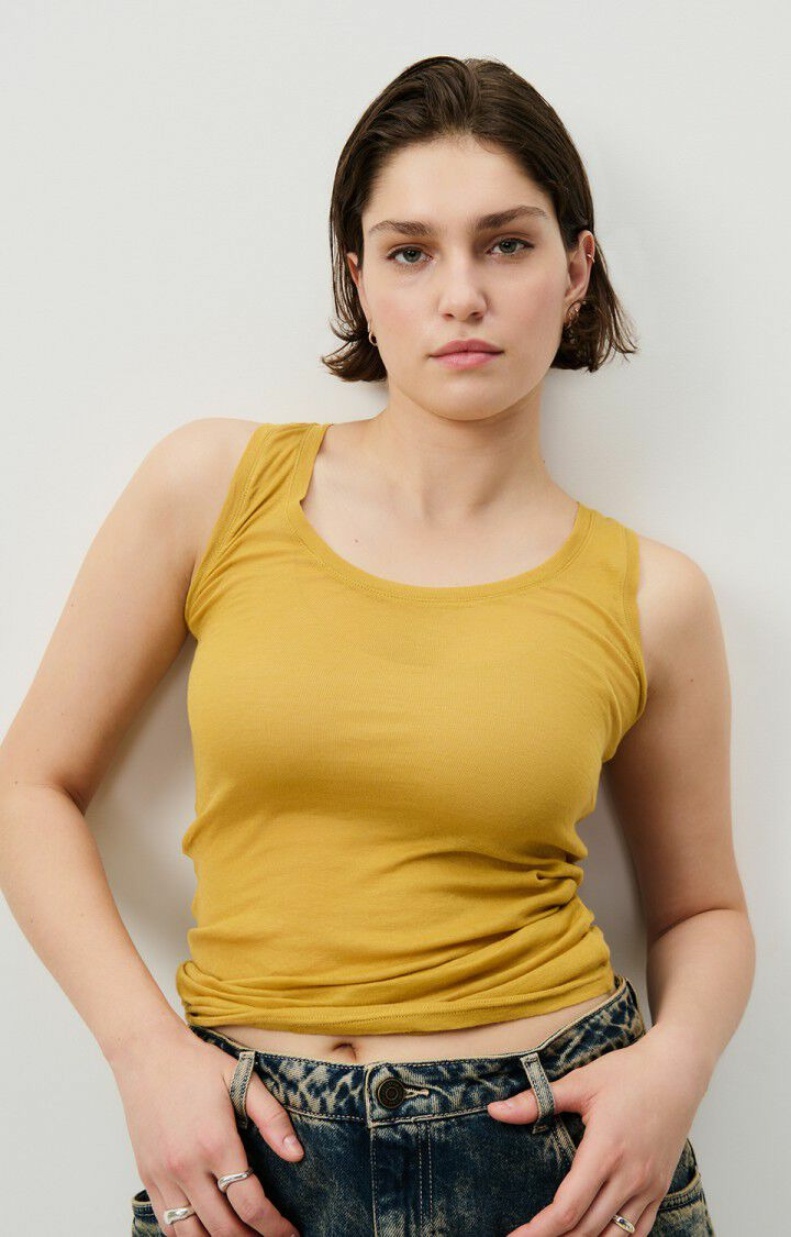 Confectionné par American Vintage, ce débardeur allie confort et élégance grâce à son tissu doux et léger qui épouse délicatement la silhouette. Son design minimaliste se prête aussi bien à un look casual qu’à une tenue plus sophistiquée, pour une polyvalence sans compromis.