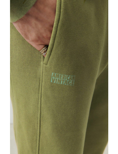 Réponse : Le jogging est fabriqué dans une matière douce et résistante, typique des collections American Vintage, garantissant confort et longévité.