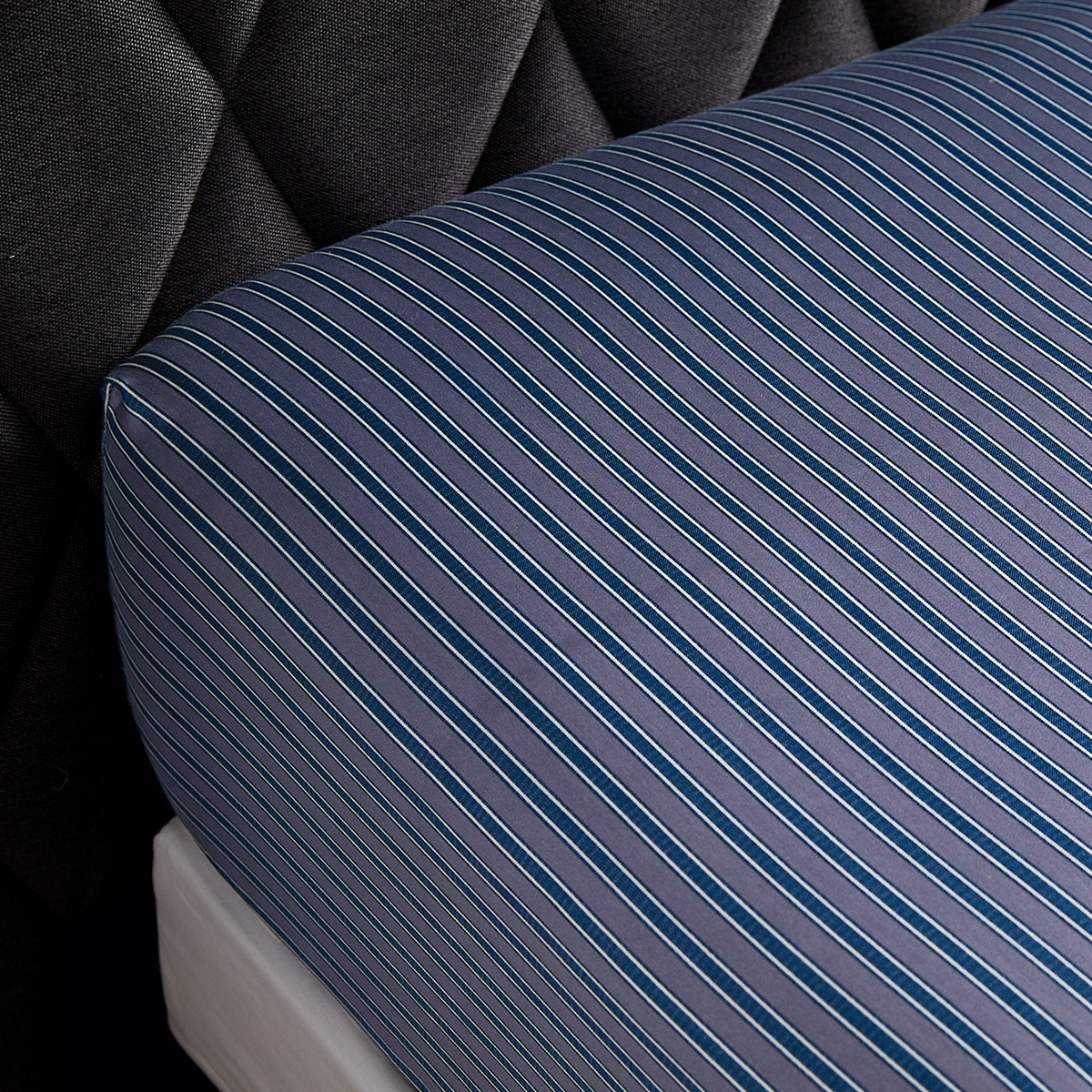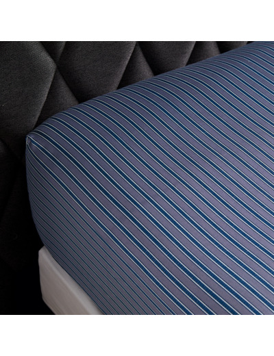 Une rayure issue du dessin principal à l’esprit pyjama de soie masculin se présente sur le drap housse du modèle. Hécate est confectionné à partir de coton biologique certifié GOTS, garantissant une production respectueuse de l'écosystème et des normes éthiques élevées. La douceur incomparable du satin de coton, tissé 120 fils/cm², crée une sensation de confort et de bien-être, enveloppant votre peau dans une caresse soyeuse chaque nuit.