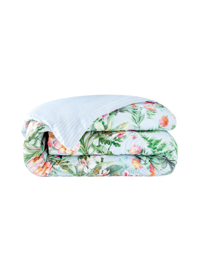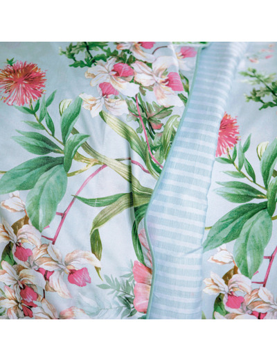 L’impression des orchidées, d’hibiscus et clématites est sublimée par le support choisi en satin 120 fils/cm² en coton issu de l’agriculture biologique.