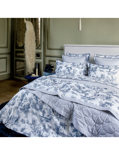 Le motif de toile de Jouy est réversible sur une fine rayure délicate.