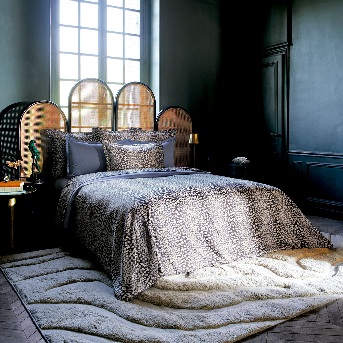 La housse de couette est réversible sur un dessin qui évoque les peaux de cuirs de Galuchat et qui souligne son caractère très décoratif.