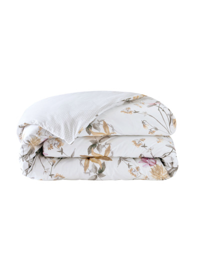 Le modèle Perle Lune est composé de cette housse de couette, des taies d’oreillers, de la taie de traversin, du drap plat et du drap housse. Une gamme de serviettes éponge et un peignoir féminin complètent cette parure.