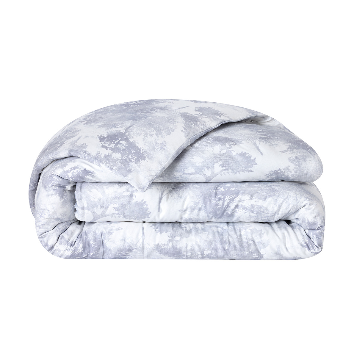 Les nuances givrées se fondent sur les deux faces en un subtil dégradé gris-bleuté aux vertus apaisantes, où les arbres semblent nimbés d'une aura féérique.