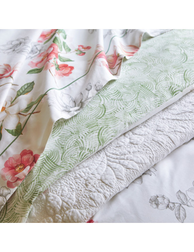 Imprimé sur une percale 80 fils/cm² 100% coton biologique, les motifs floraux de Villandry cohabitent avec un motif néo-géométrique, tels un jardin foisonnant au printemps.
