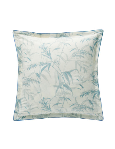 Les taies d’oreillers, rehaussées d’un volant plat de 3 cm et d’une finition biais bleu, apportent une touche de sophistication discrète.