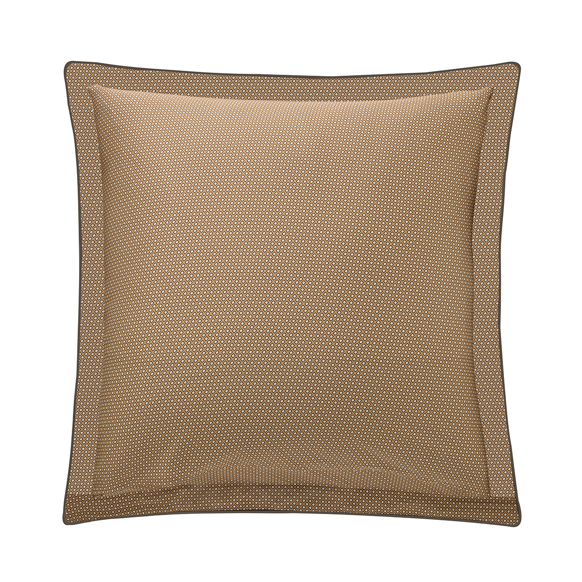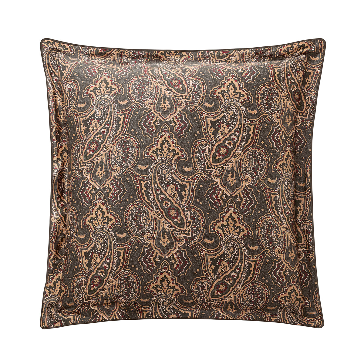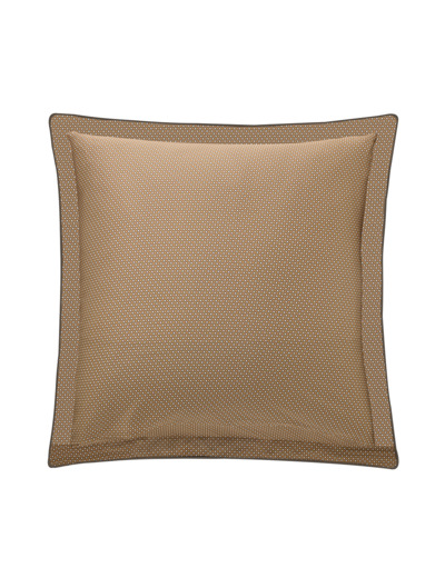 La taie offre un motif de palmettes aux tons ocres et vert anglais réversible sur un imprimé inspiré des pochettes de costumes masculins.