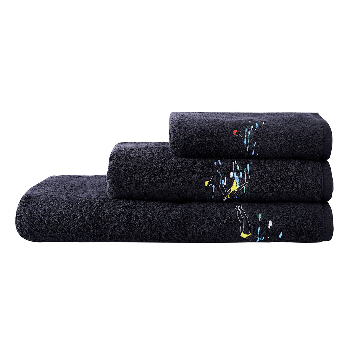 Sa taille est de 70 x 140 cm. Son grammage de 550 gr/m² et sa composition en éponge bouclette 100% coton peigné vous assurent douceur et absorption. La broderie multicolore de ces nageurs s’épanouit sur cette éponge noire.