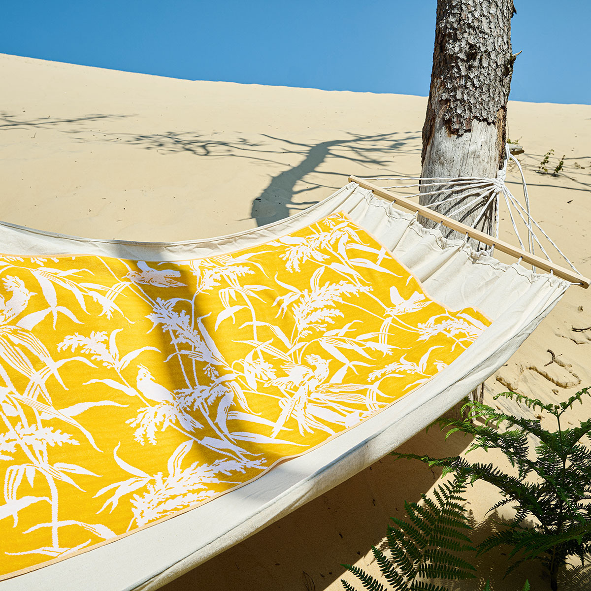 Estampe, drap de plage en jacquard jaune et blanc, combine style et praticité avec une ingénieuse touche signée Anne de Solène.