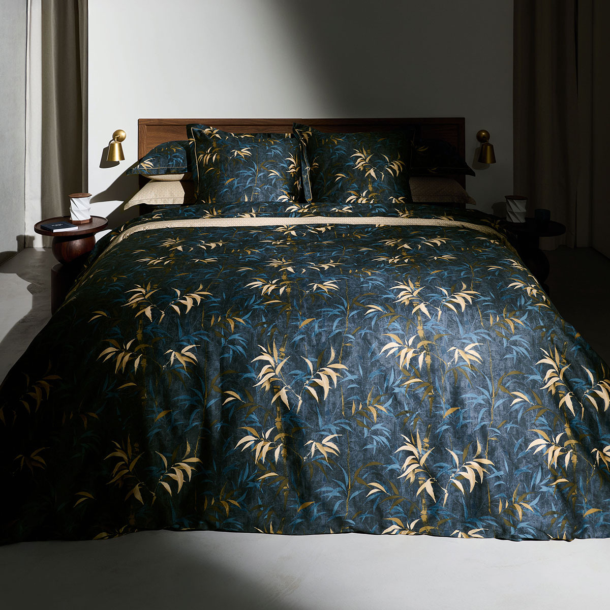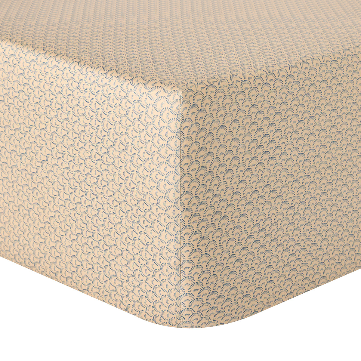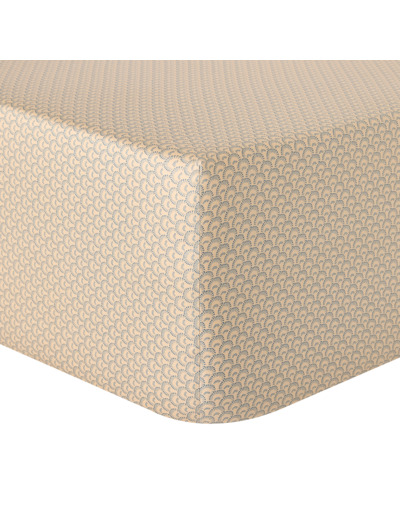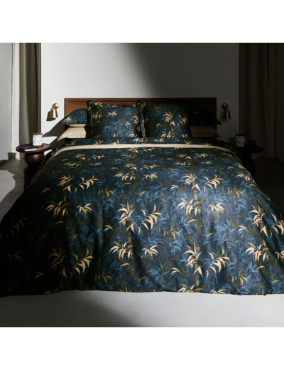 Paré de palmettes bleu nuit sur un fond bronze, le drap housse en satin de coton biologique de 120 fils/cm² garantit un confort incomparable, alliant fluidité et résistance.