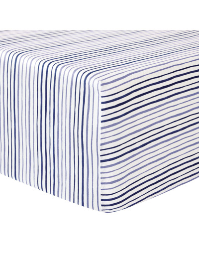 L’impression rayée en aquarellée de bleu se sublime sur la percale de coton 80 fils/cm², qui offre à la fois douceur et confort.