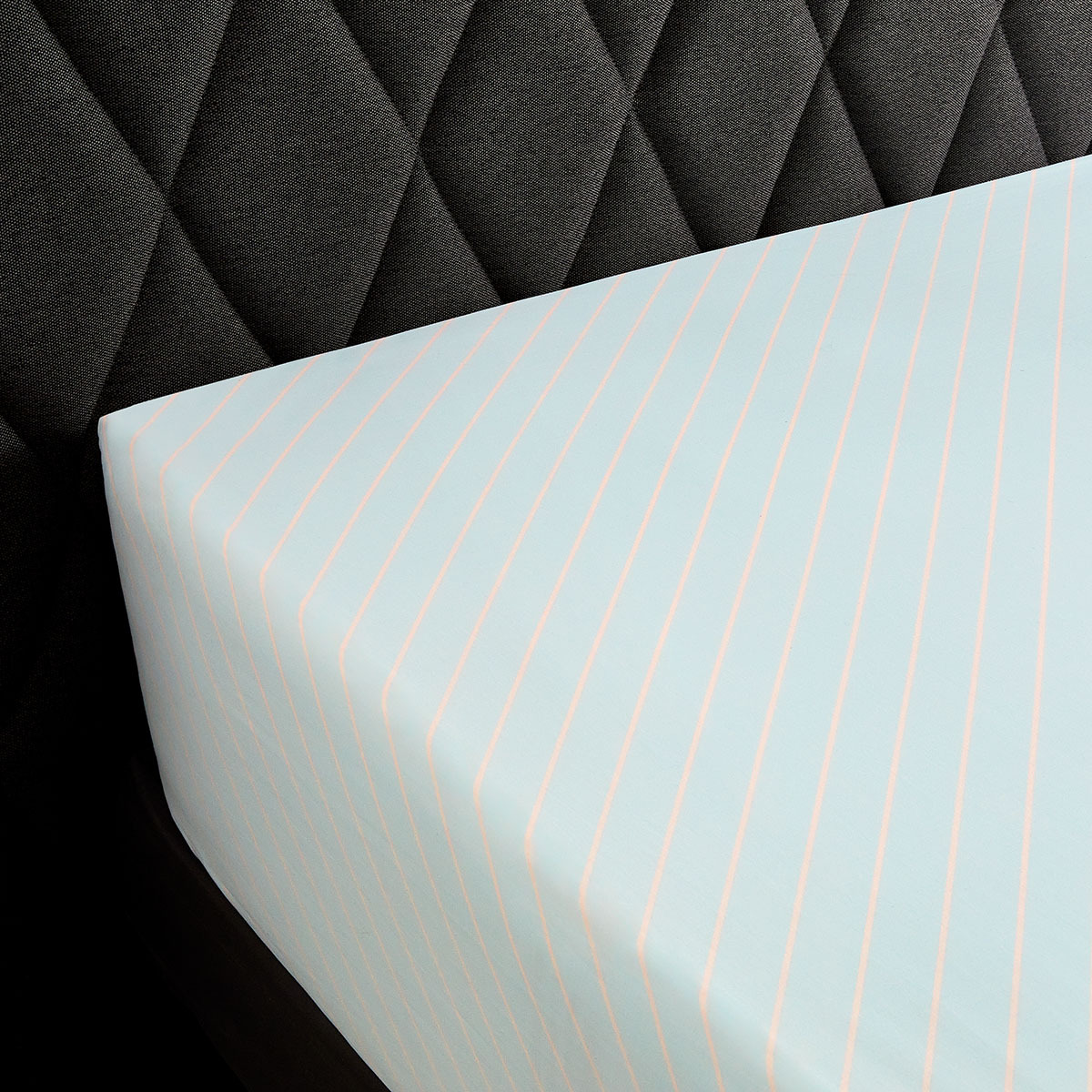 L’impression de ce jeu de rayures se révèle avec finesse sur une percale de coton biologique 80 fils/cm², alliant élégance et confort incomparable.