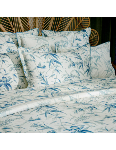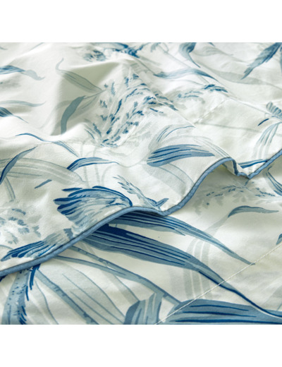 Orné de feuillages luxuriants et de perruches bleus sur un fond ivoire lumineux, ce drap plat apporte une note d’élégance naturelle à votre chambre.