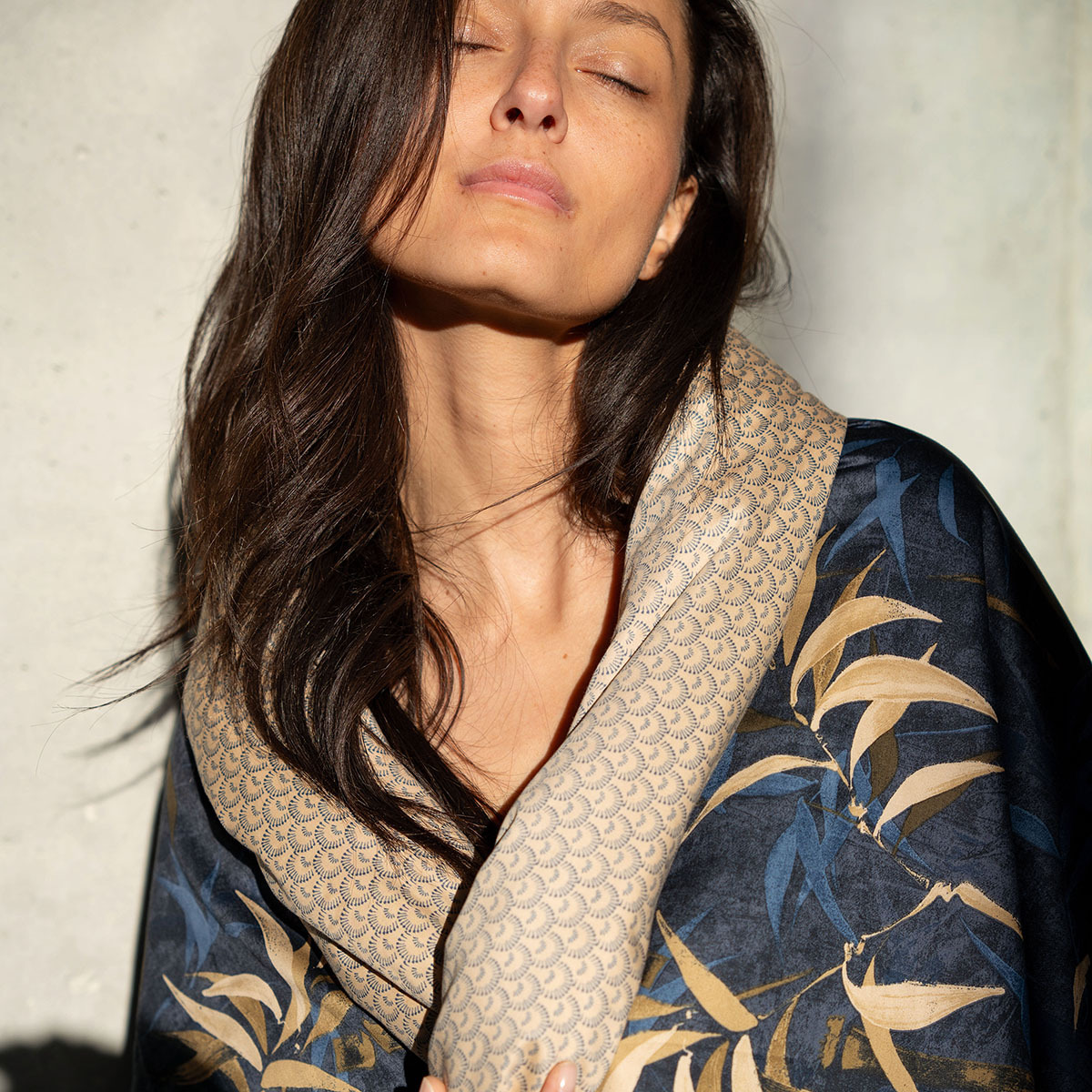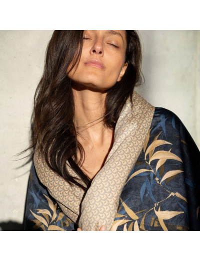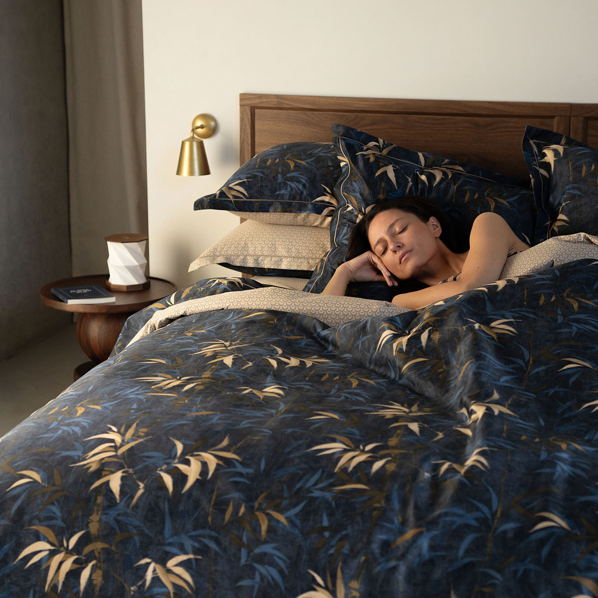 Comme un cocon réconfortant, le bois chaud s’harmonise aux teintes profondes et réchauffe l’âme. Les contrastes entre les teintes profondes d’un presque noir et les nuances bleu nuit et de beige doré créent une composition apaisante et illustrent le luxe dans sa simplicité.