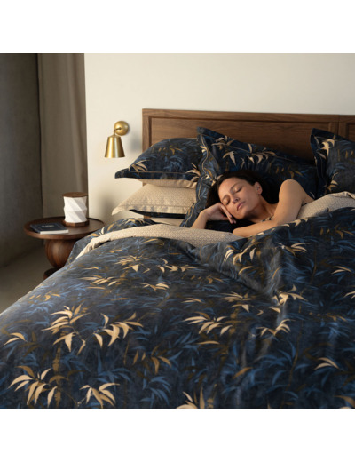 La housse de couette imprimée sur satin de coton biologique 120 fils/cm² offre un motif feuillage réversible sur une palmette dans les tonalités de bronze.