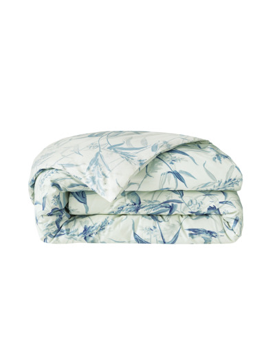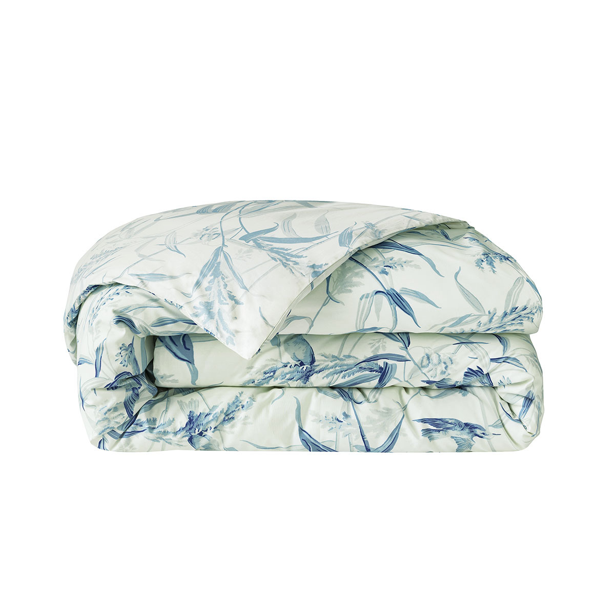 Le recto, s’anime de végétaux luxuriants et de perruches bleues majestueuses sur fond ivoire et s’associe à un verso imprimé de feuillages dans une tonalité plus douce de bleu sur fond ivoire.