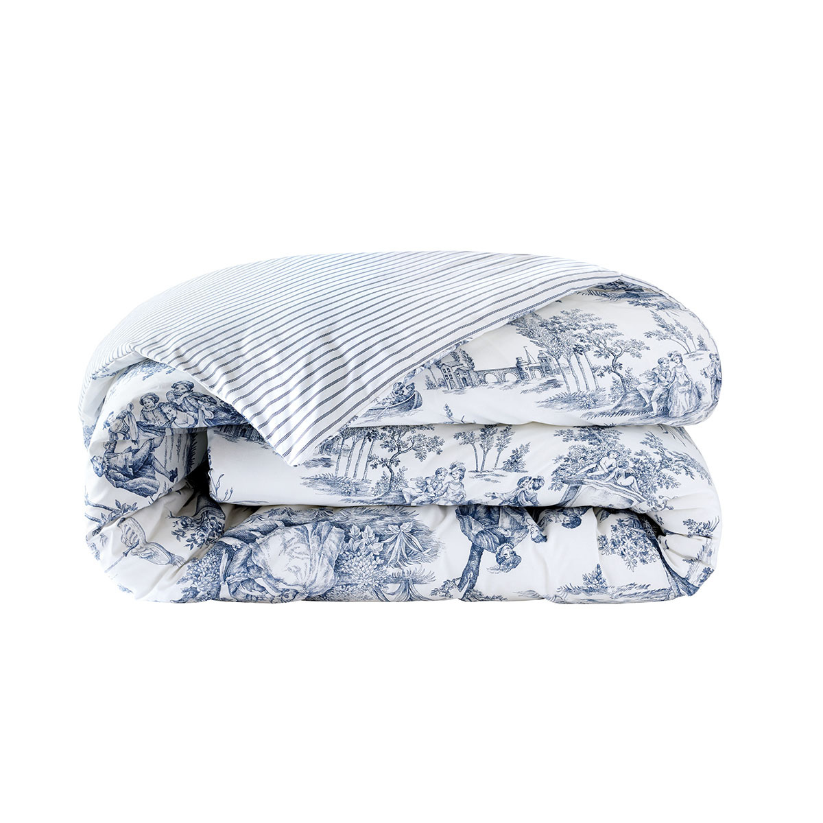 Le motif de toile de Jouy est réversible sur une fine rayure délicate.