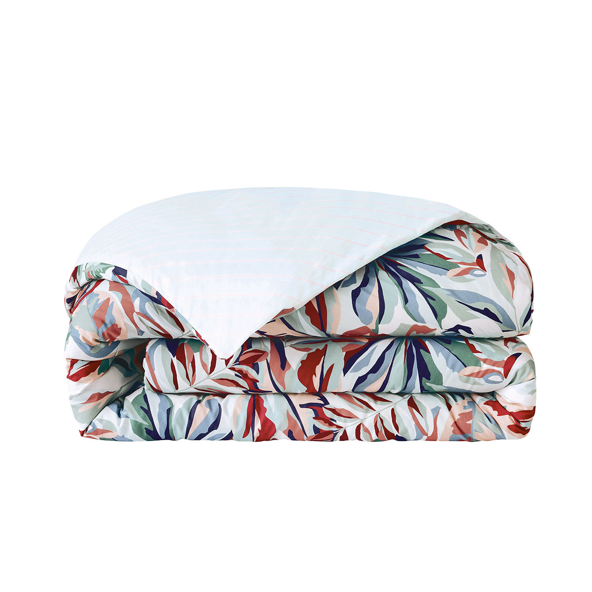 Le recto, orné de feuilles exotiques multicolores, se pare d’un verso aux rayures diagonales sur fond vert clair, ajoutant une touche graphique subtile.