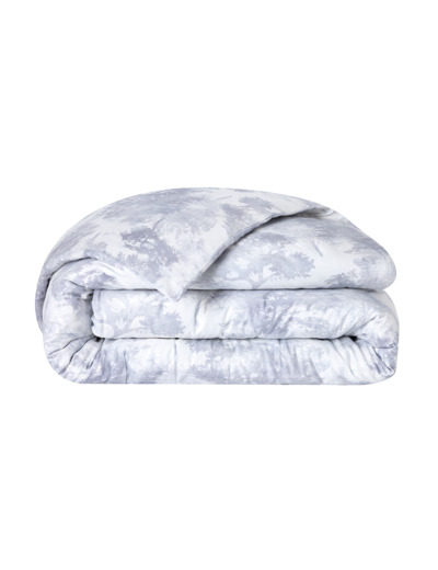 Les nuances givrées se fondent sur les deux faces en un subtil dégradé gris-bleuté aux vertus apaisantes, où les arbres semblent nimbés d'une aura féérique.