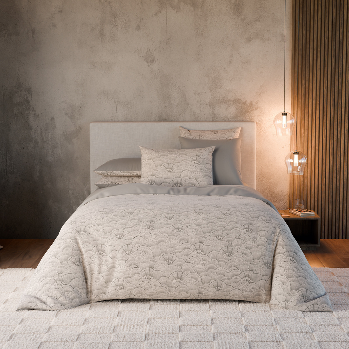 Son motif en éventails gris sur fond ivoire installe une ambiance raffinée et sereine, propice à la détente tout au long de l’année.