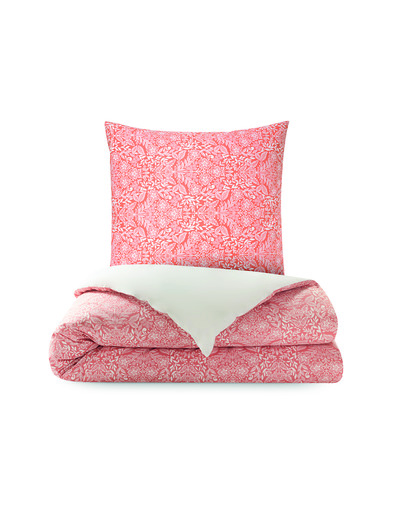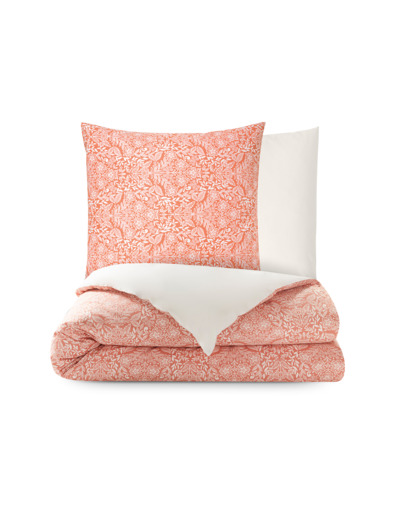 Plongez dans un rêve de douceur avec notre parure de linge en percale de coton 80 fils/cm², délicatement ornée de petites fleurs bicolores en corail et blanc doux.