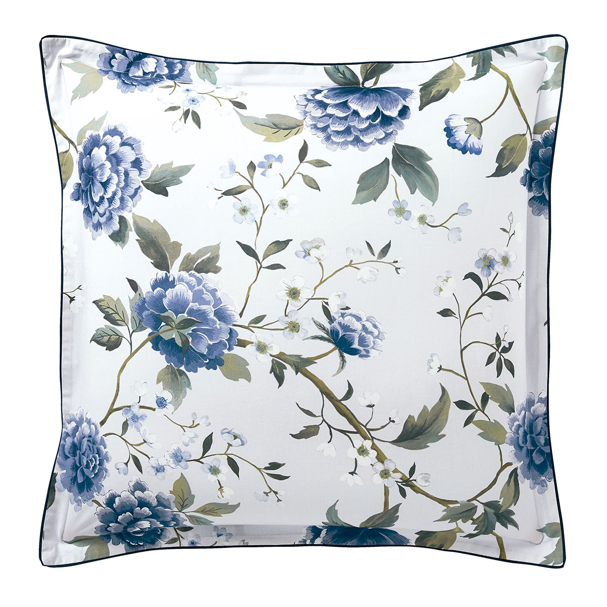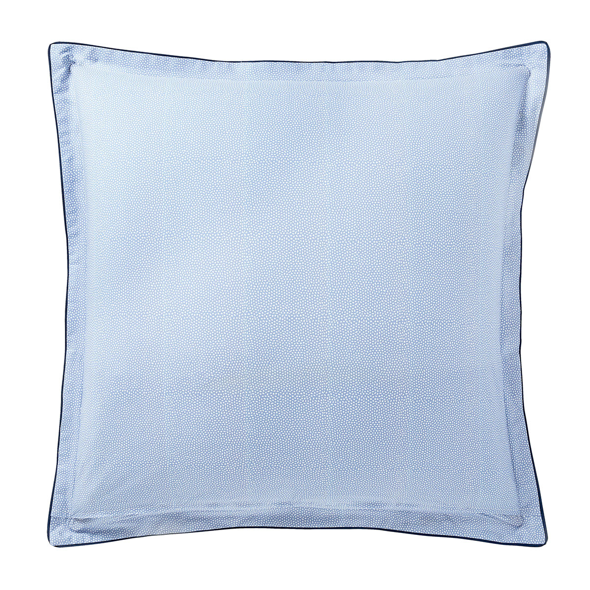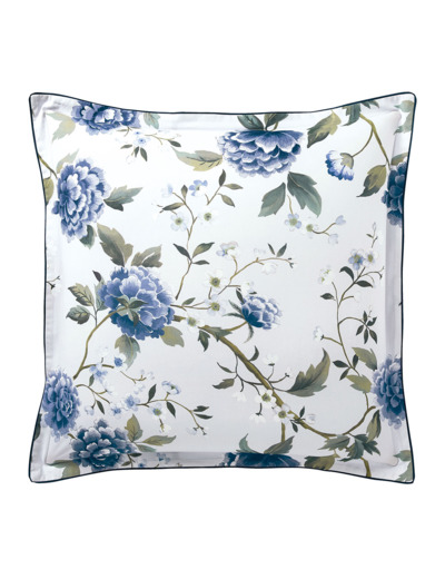 Le revers est un motif géométrique. Pour une finition élégante, la taie est confectionnée en volant plat de 3cm avec un biais bleu profond. Elle existe dans 2 tailles : 65 x 65 et 50 x 75 cm.