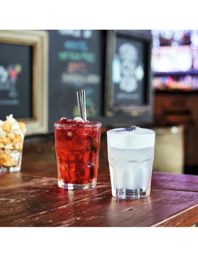 Profitez d’une résistance accrue grâce au verre trempé, garantissant une longévité exceptionnelle même en usage intensif. La capacité de 27cl est idéale pour servir une large gamme de boissons, du cocktail au jus frais, avec une tenue parfaite en main et une stabilité renforcée.