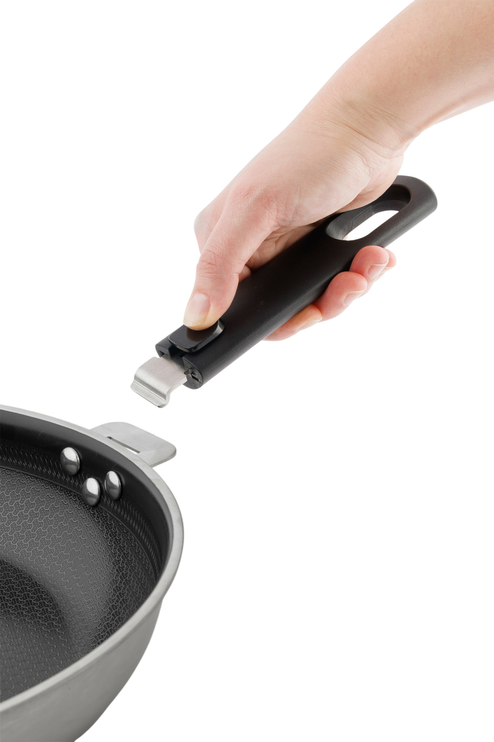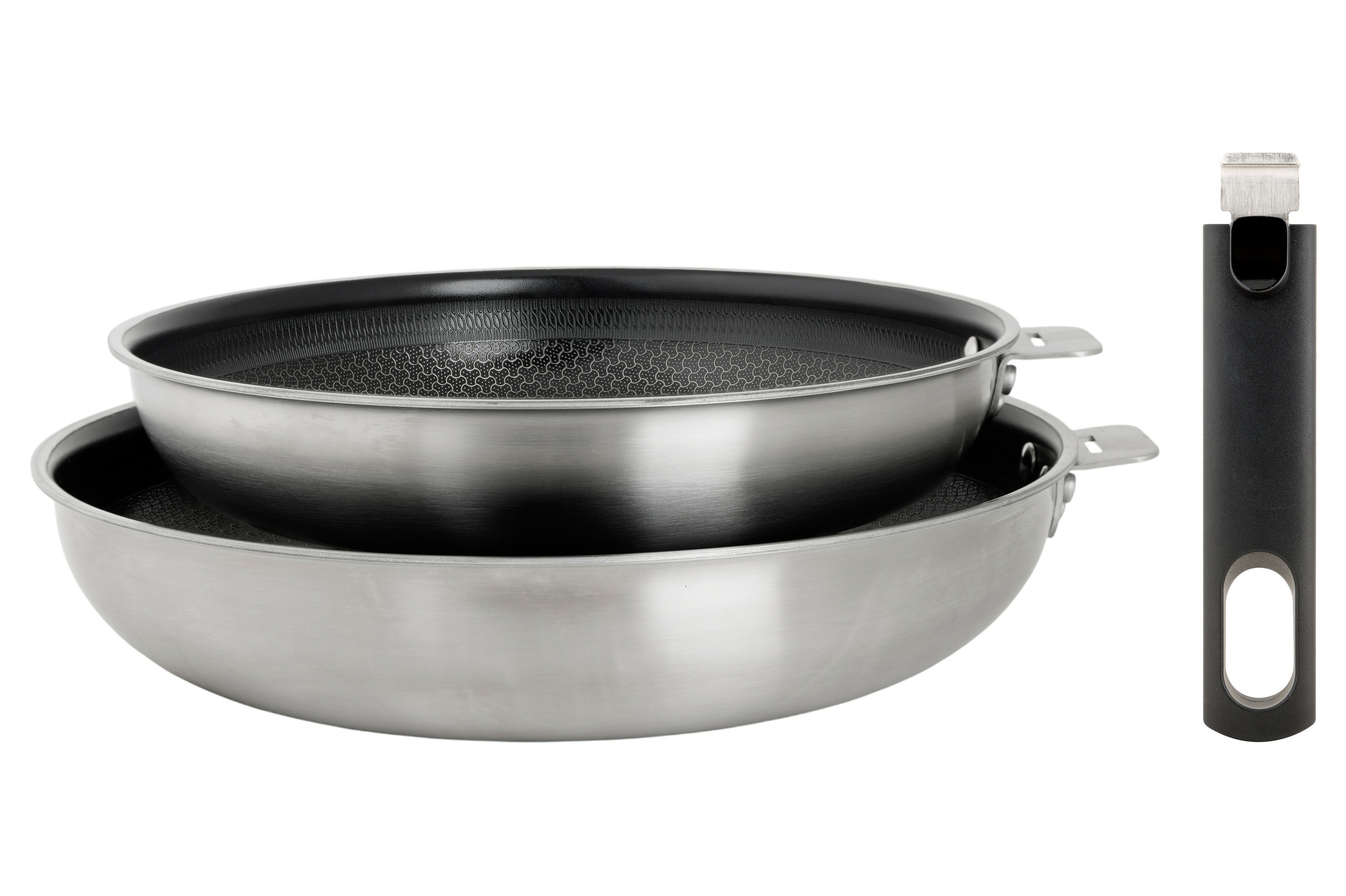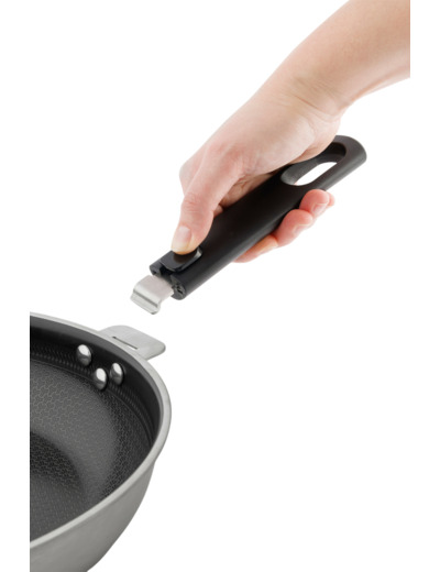 Dimensions 24 et 28 cm. Acier inoxydable avec revêtement anti-adhésif hybride sans PFAS. Construction 3 couches 3-Ply pour une diffusion optimale de la chaleur. Compatible tous feux, induction incluse. Résiste au four jusqu’à 200°. Poignée amovible Click! pour un usage modulable.