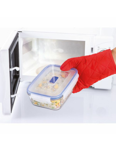 Capacité : 82 cl. Matière : verre trempé et plastique. Couvercle hermétique avec quatre clips et valve pour micro-ondes. Compatible congélateur et lave-vaisselle. Disponible en neuf contenances et trois formes (ronde, carrée, rectangulaire).