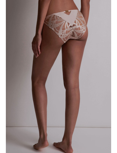Modèle culotte, taille aux hanches, couvrante, au feston décoratif sur les fesses. Bénéfice : une culotte enrichie au dos.