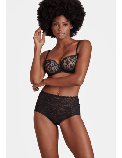 Sublime dans son style rétro-chic, la culotte haute est à la fois sexy et confortable. Sa forme galbante revêt les courbes d’une parure romantique pour un rêve de séduction qui flotte du bas des hanches jusqu’au nombril.
