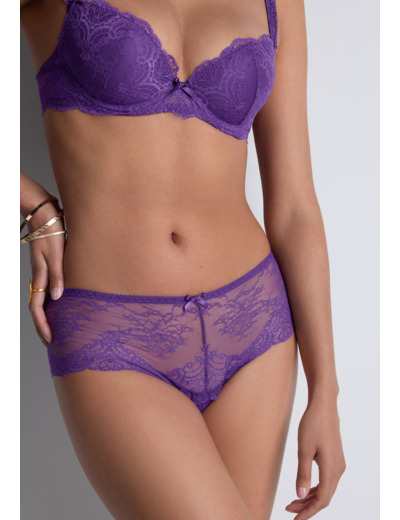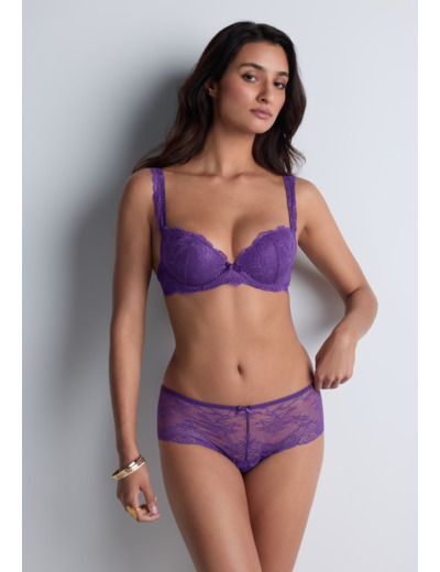 Le shorty dessine sur les hanches sa forme shorty avec sa coupe taille basse et large sur les côtés. Confortable et moderne, la pièce est sublimée par des dentelles raffinées.