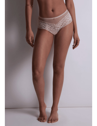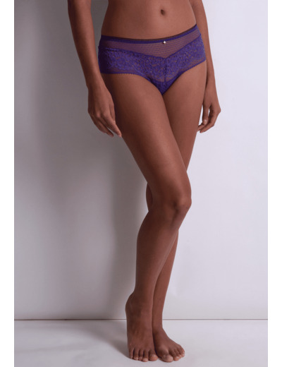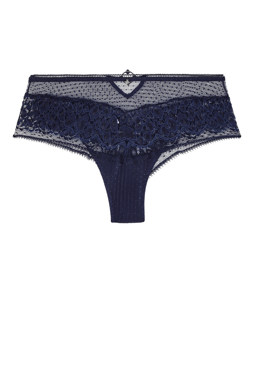 Le shorty dessine sur les hanches sa forme shorty avec sa coupe taille basse et large sur les côtés. Confortable et moderne, la pièce est sublimée par des dentelles raffinées.
