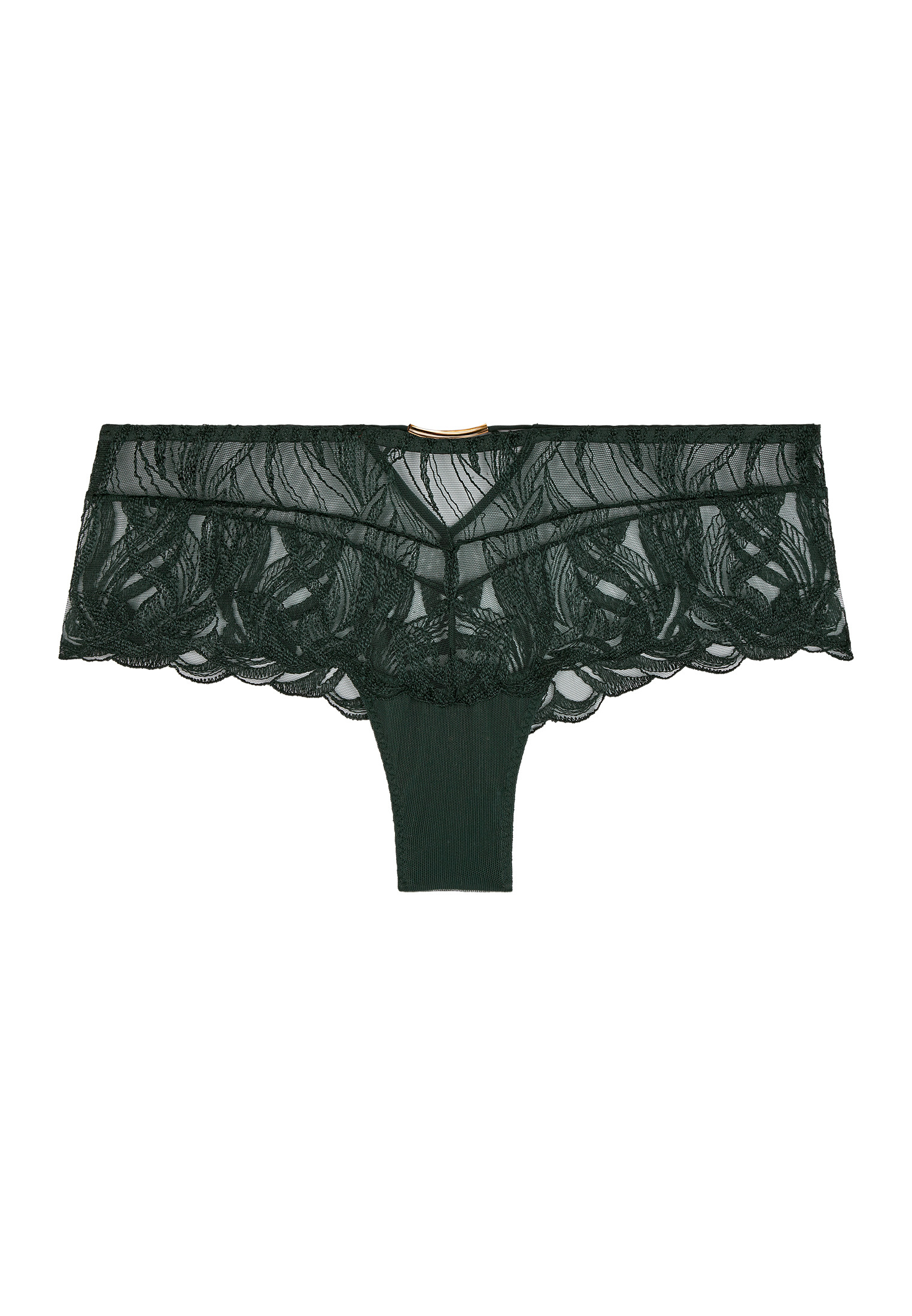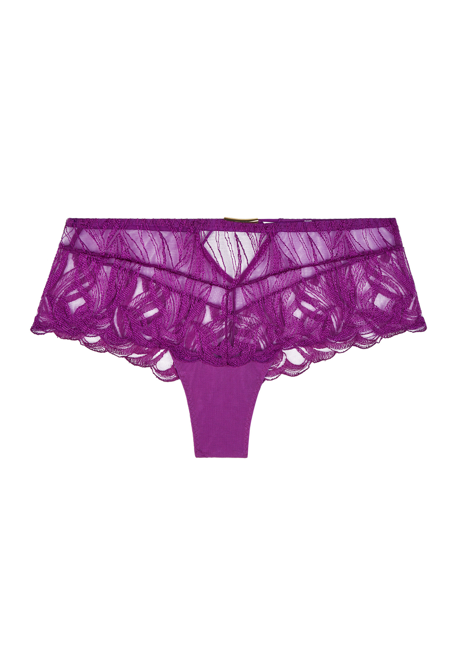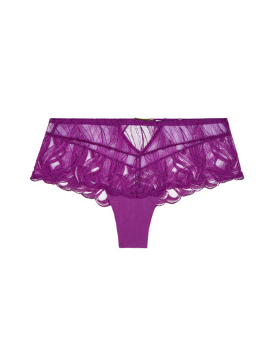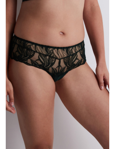 Le shorty dessine sur les hanches sa forme shorty avec sa coupe taille basse et large sur les côtés. Confortable et moderne, la pièce est sublimée par des dentelles raffinées.