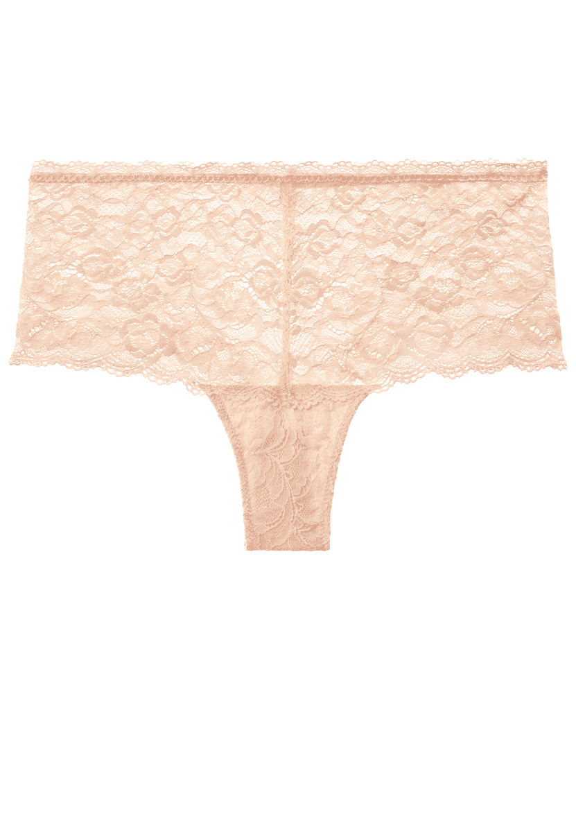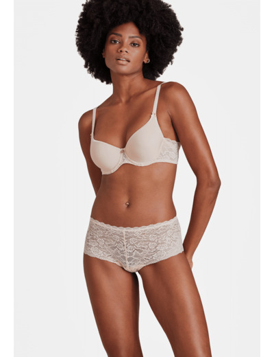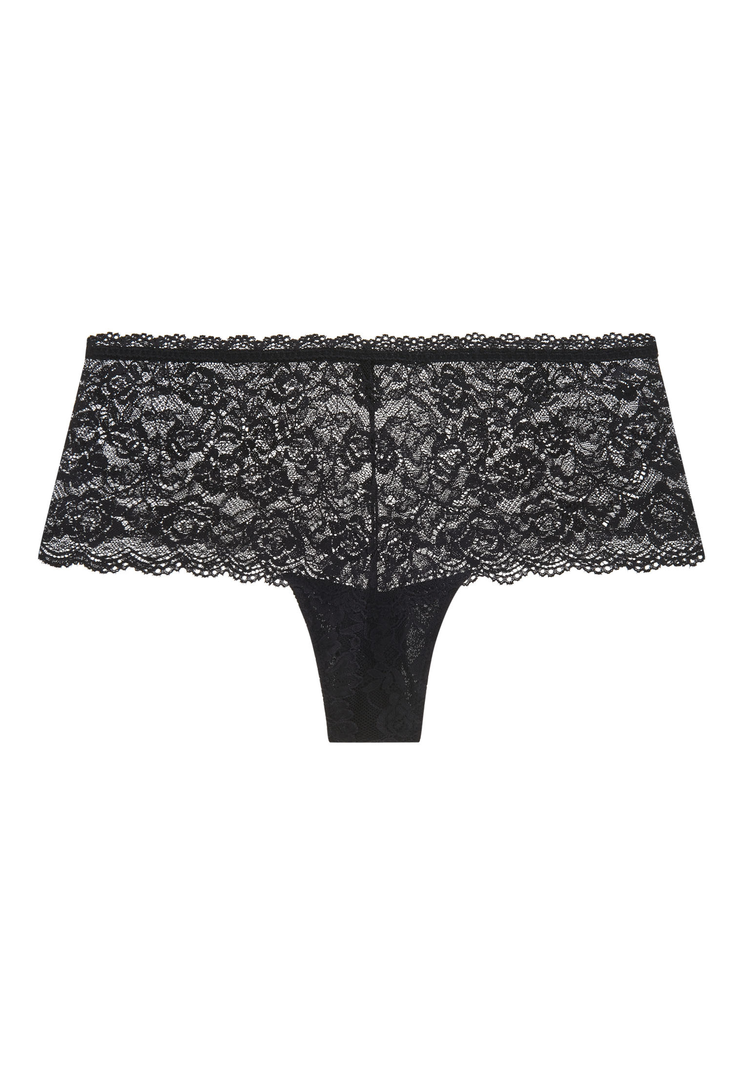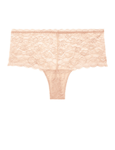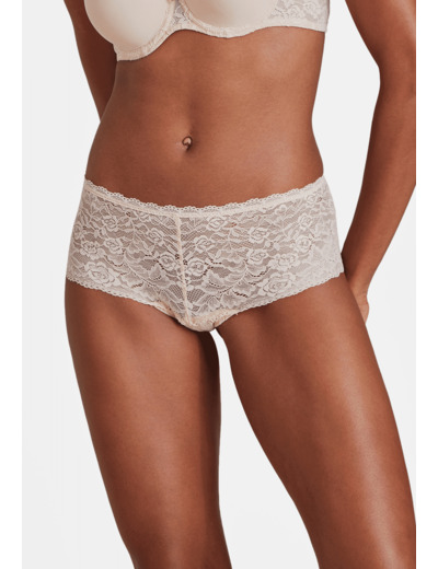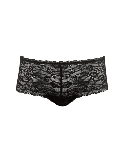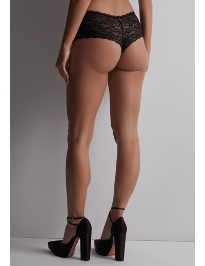 Le shorty dessine sur les hanches sa forme shorty avec sa coupe taille basse et large sur les côtés. Confortable et moderne, la pièce est sublimée par des dentelles raffinées.