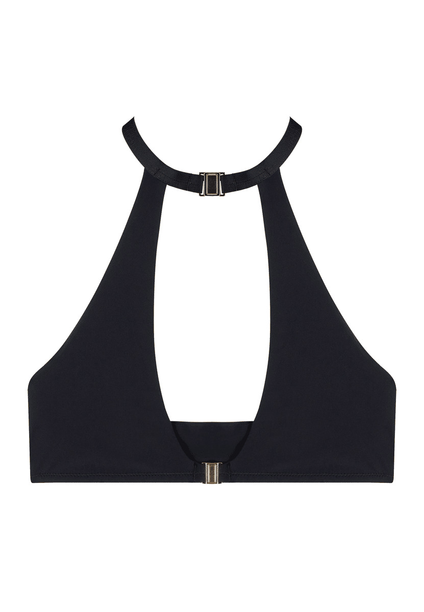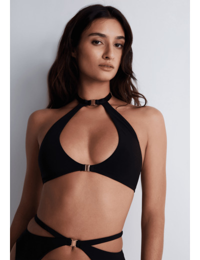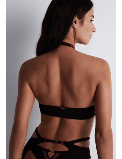 La brassière offre une coupe originale avec des bretelles larges portées basses sur les épaules pour un décolleté élégant et ouvert et un dos sexy, dans un jeu de bandes résolument mode.