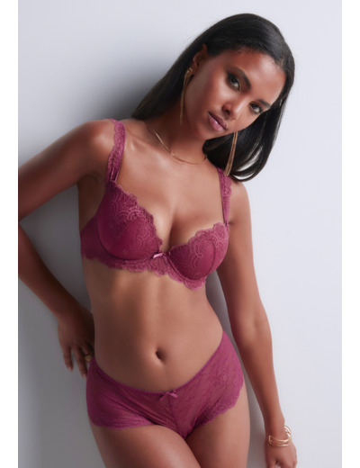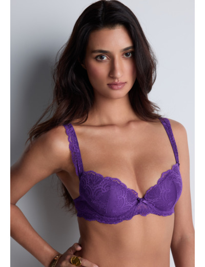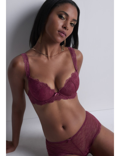 Rapprochant les seins dans un effet push-up naturel et sexy, le soutien-gorge plunge coque agrandit visuellement le buste grâce à sa matière qui remonte sur les côtés de la poitrine et le détail des double liens habillant la naissance des bretelles. Structuré, il offre un décolleté profond et sexy, encore davantage mis en valeur par une broderie graphique raffinée, idéale à arborer sous un haut ajouré ou transparent pour des jeux de contraste, de brillance et de dévoilement.