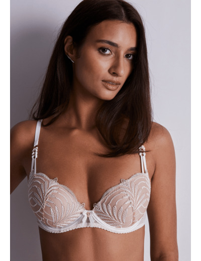 Rapprochant les seins dans un effet push-up naturel et sexy, le soutien-gorge plunge coque agrandit visuellement le buste grâce à sa matière qui remonte sur les côtés de la poitrine et le détail des double liens habillant la naissance des bretelles. Structuré, il offre un décolleté profond et sexy, encore davantage mis en valeur par une broderie graphique raffinée, idéale à arborer sous un haut ajouré ou transparent pour des jeux de contraste, de brillance et de dévoilement.