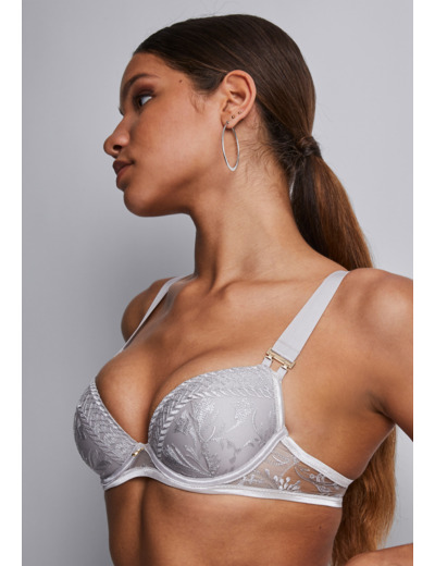 Rapprochant les seins dans un effet push-up naturel et sexy, le soutien-gorge plunge coque agrandit visuellement le buste grâce à sa matière qui remonte sur les côtés de la poitrine et le détail des double liens habillant la naissance des bretelles. Structuré, il offre un décolleté profond et sexy, encore davantage mis en valeur par une broderie graphique raffinée, idéale à arborer sous un haut ajouré ou transparent pour des jeux de contraste, de brillance et de dévoilement.