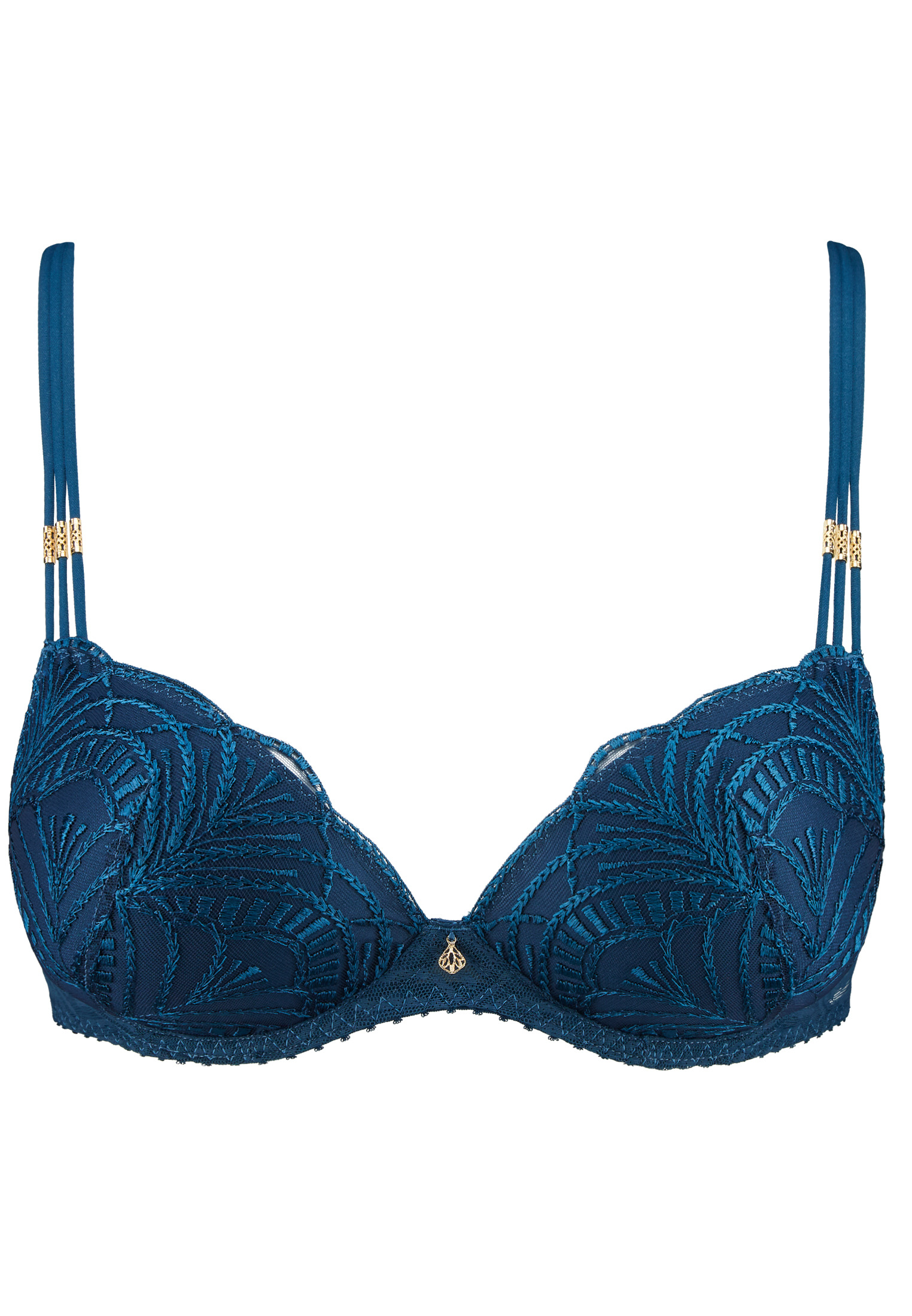 Rapprochant les seins dans un effet push-up naturel et sexy, le soutien-gorge plunge coque agrandit visuellement le buste grâce à sa matière qui remonte sur les côtés de la poitrine et le détail des double liens habillant la naissance des bretelles. Structuré, il offre un décolleté profond et sexy, encore davantage mis en valeur par une broderie graphique raffinée, idéale à arborer sous un haut ajouré ou transparent pour des jeux de contraste, de brillance et de dévoilement.