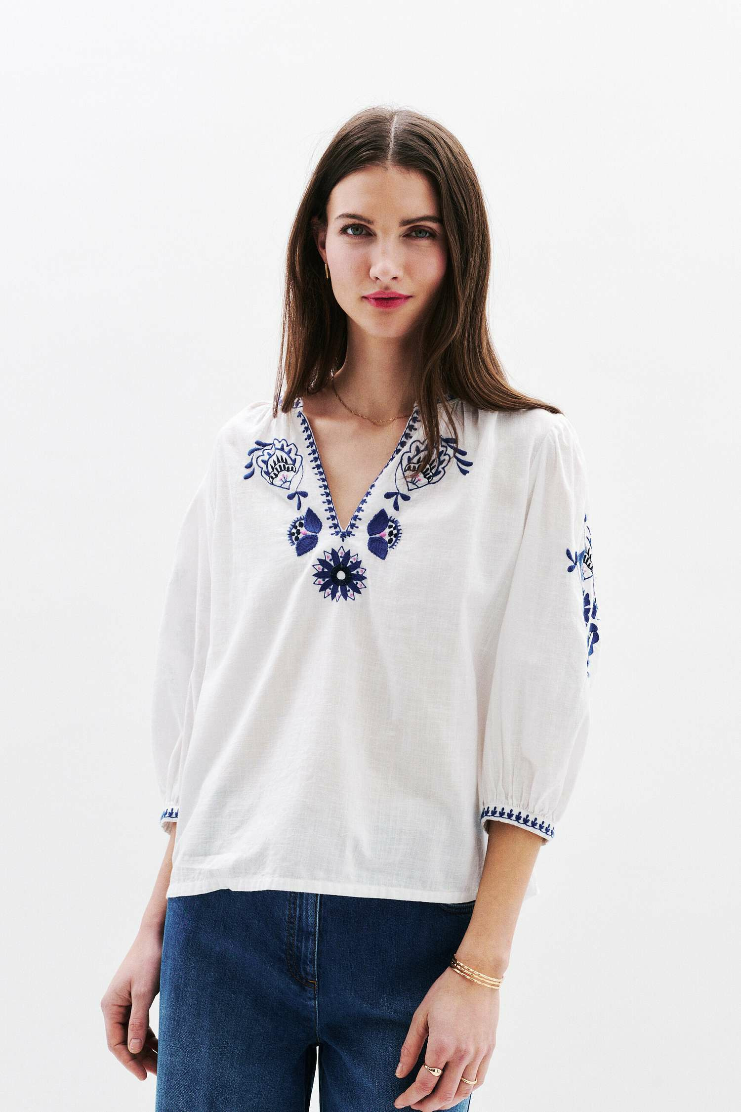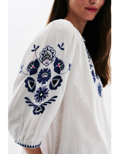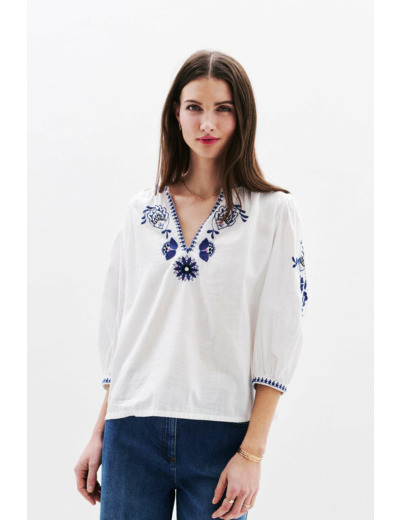 Tissu principal 100% coton, broderie 100% polyester. Col tunisien, manches trois-quarts, découpe carrure dos froncée. Longueur 60 cm en taille 38. Lavage conseillé à 30°C avec action réduite pour préserver la qualité des broderies.
