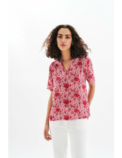 Blouse Celiane, coupe droite, col tunisien, manches courtes, longueur 64 cm (taille 38). Tissu principal : viscose 100%. Entretien recommandé : nettoyage à sec professionnel ou lavage à 30°C en cycle délicat. Repassage à température moyenne (max 150°). Sèche-linge interdit.