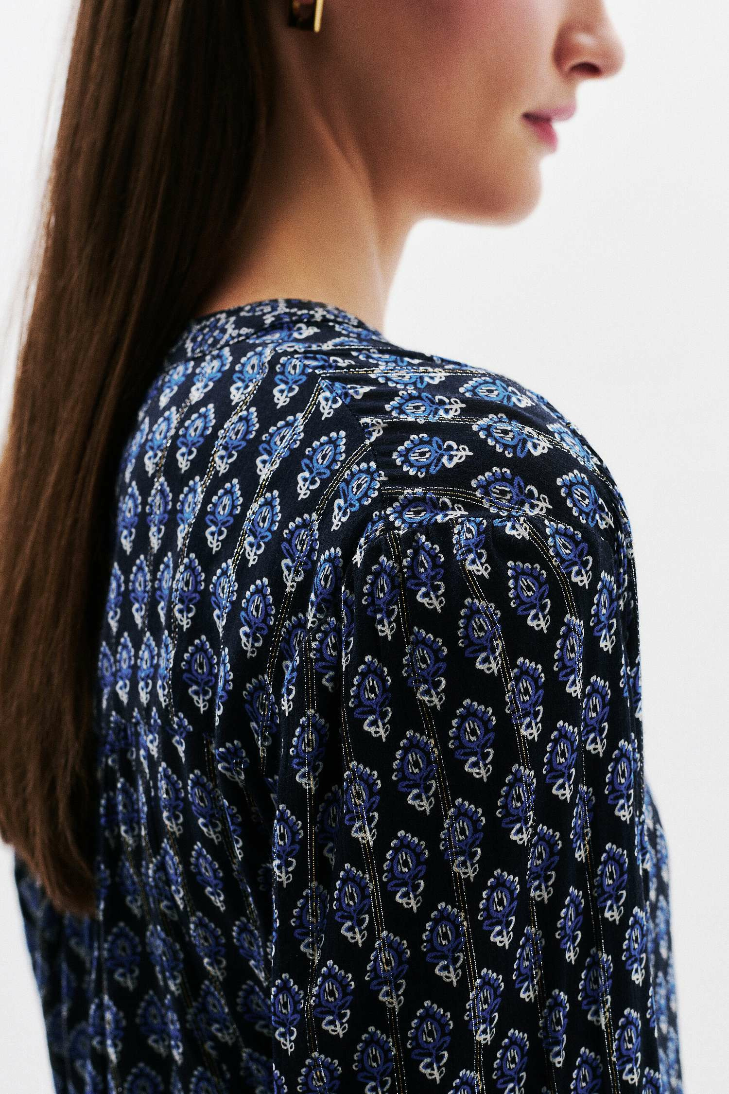 Blouse à coupe droite, col tunisien, manches longues, longueur 65,5 cm en taille 38. Disponible du 34 au 46. Composition : 99% viscose, 1% fil métallisé. Entretien recommandé : nettoyage à sec professionnel ou lavage à 30°C en cycle délicat, repassage à température moyenne (maximum 150°), sèche-linge interdit.