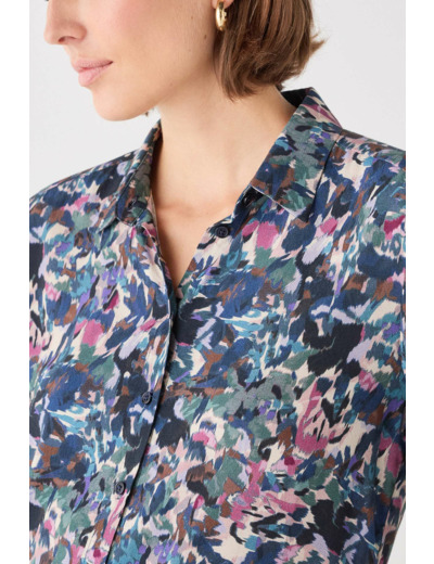 Tissu principal : 51 % viscose Lenzing Ecovero, 49 % viscose. Coupe droite, col chemise, manches longues. Longueur 67 cm en taille 38. Tailles disponibles : du 34 au 46. Lavage conseillé à 30°C en cycle délicat, repassage à température moyenne (max 150°), sèche-linge interdit.