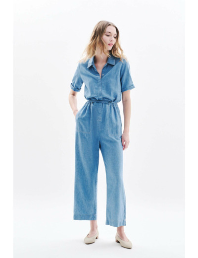 Conçue dans un mélange coton, lin et lyocell, cette combinaison façon denim se distingue par son col chemise et sa taille cintrée grâce à un lien coulissant à nouer. Les manches courtes et les jambes fluides offrent une silhouette moderne et facile à porter. Accessoirisez-la d’une ceinture en cuir tressé pour un look affirmé, à associer aussi bien avec des boots en mi-saison que des sandales dès les beaux jours.