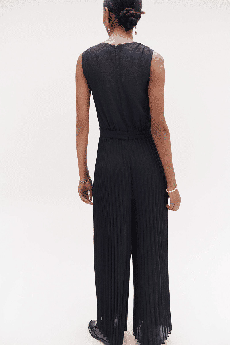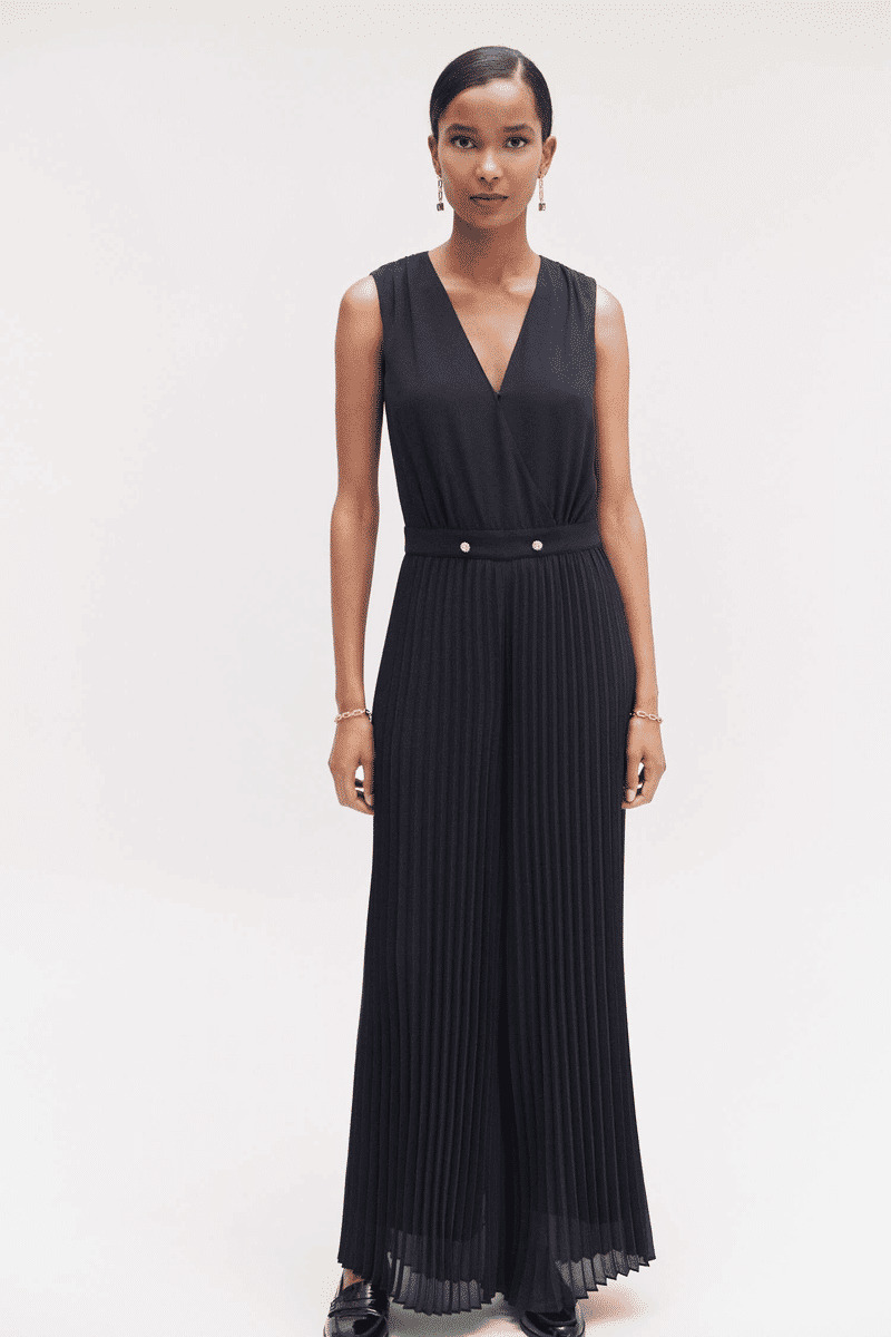 La combinaison Soanne associe un top cache-cœur en crêpe drapé, orné de boutons bijoux, à une jambe ample et entièrement plissée pour un mouvement gracieux. Sa taille marquée par un empiècement ceinture souligne votre silhouette avec finesse, tandis que la fermeture zippée invisible au dos assure un maintien parfait et discret. Cette combi-pantalon est pensée pour sublimer toutes les occasions, du bureau aux soirées.