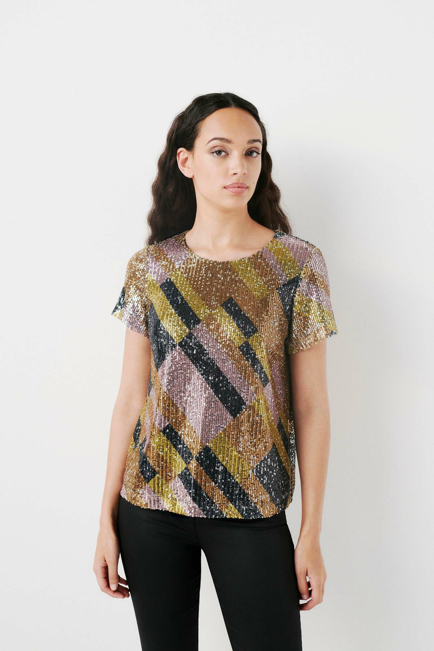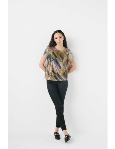 Sublimez votre allure avec la blouse Camila2, un équilibre parfait entre élégance et modernité. Son motif géométrique à sequins apporte une touche de lumière discrète, idéale pour vos soirées comme pour vos journées.